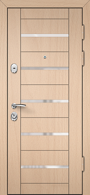 Эта бронированная дверь в современном дизайне №28 станет отличным решением для частного дома, квартиры или офиса, предлагая надежную защиту и стильный внешний вид. Ее конструкция включает каркас из профильной трубы 50х25 мм и металлическое полотно толщиной 2 мм, что обеспечивает прочность и долговечность. Внешняя и внутренняя отделка выполнены из плиты МДФ, придающей двери современный вид и стойкость к механическим повреждениям. Хотя терморазрыв отсутствует, конструкция с терморазрывом коробки и полотна помогает снижать теплопотери. Дополнительную безопасность обеспечивают два замка — сувальдный и цилиндровый, оба с тремя ригелями. В дверь можно добавить зеркало, стеклопакет или кованые элементы, а также установить видеодомофон, что делает эту модель максимально универсальной и индивидуальной. Бронированная дверь в современном дизайне №28 от производителя: быстрое изготовление и монтаж в Некрасовском, индивидуальные размеры, широкий выбор материалов и фурнитуры, официальная гарантия до 10 лет.
